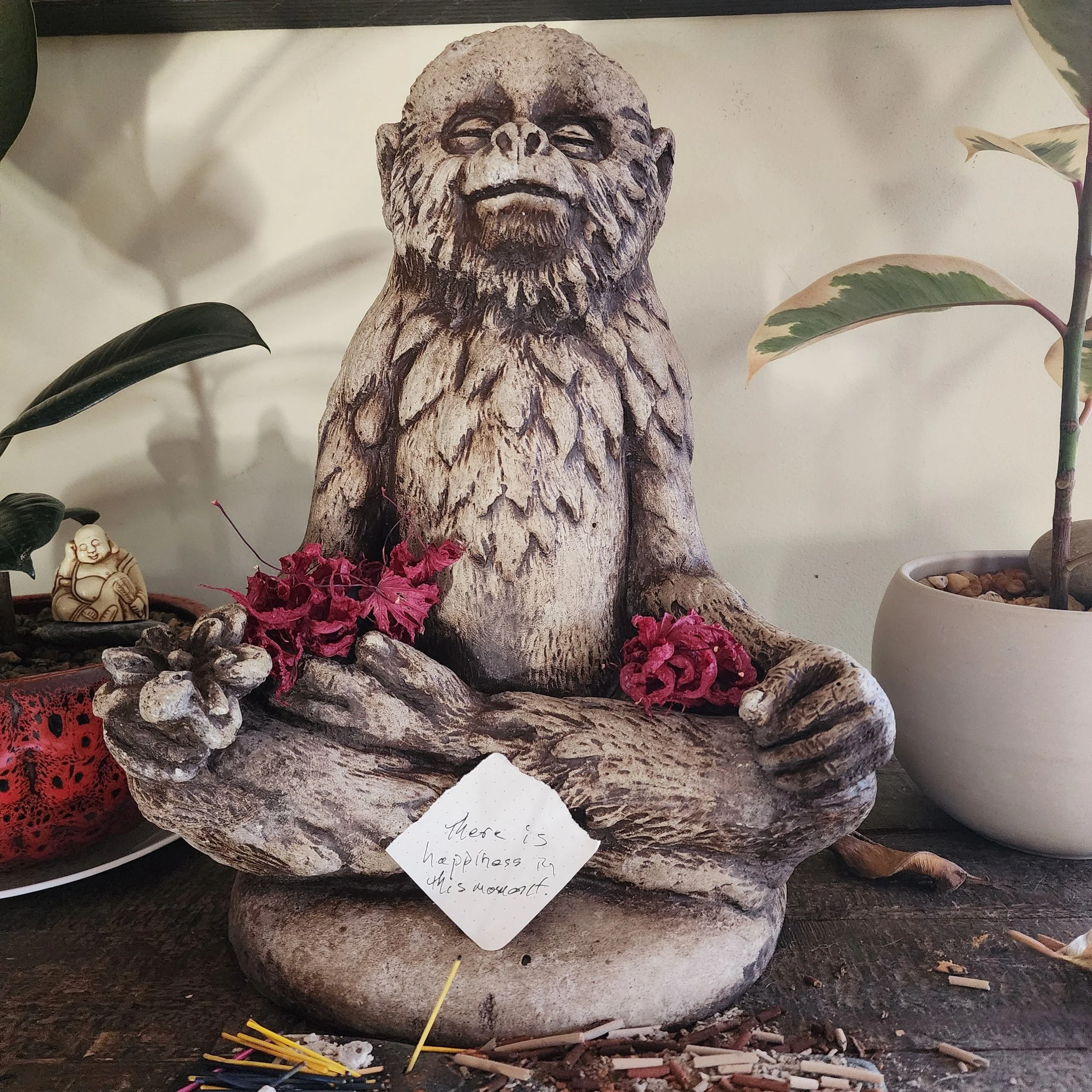 A stone monkey chilling, deep in the knowledge that there is happiness in this very moment.